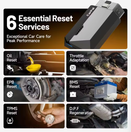 Podignite održavanje svog vozila na višu razinu. Ovaj napredni dijagnostički alat nudi šest najčešćih usluga resetiranja kako bi vaš automobil bio u vrhunskom stanju. Prve su funkcije poput resetiranja ulja i resetiranja sustava za nadzor tlaka u gumama (TPMS) za upravljanje dnevnim potrebama vašeg vozila; zatim slijede resetiranje sustava upravljanja baterijom (BMS) i resetiranje elektroničke parkirne kočnice (EPB) za uglađeniju vožnju. Osim toga, prilagodba leptira za gas i regeneracija filtera čestica dizelskog motora (DPF) održavaju optimalnu učinkovitost motora.